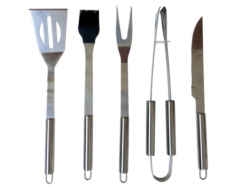 Karakteristike – Materijal: Čelik Boja: Siva Broj komada u setu: 5 Primena: Pribor za roštilj Ostalo: Četka,Kašika,Klešta,Nož,Viljuška Stanje: Nekorišćeno Reklamacioni period – Reklamacioni period: 24 meseca